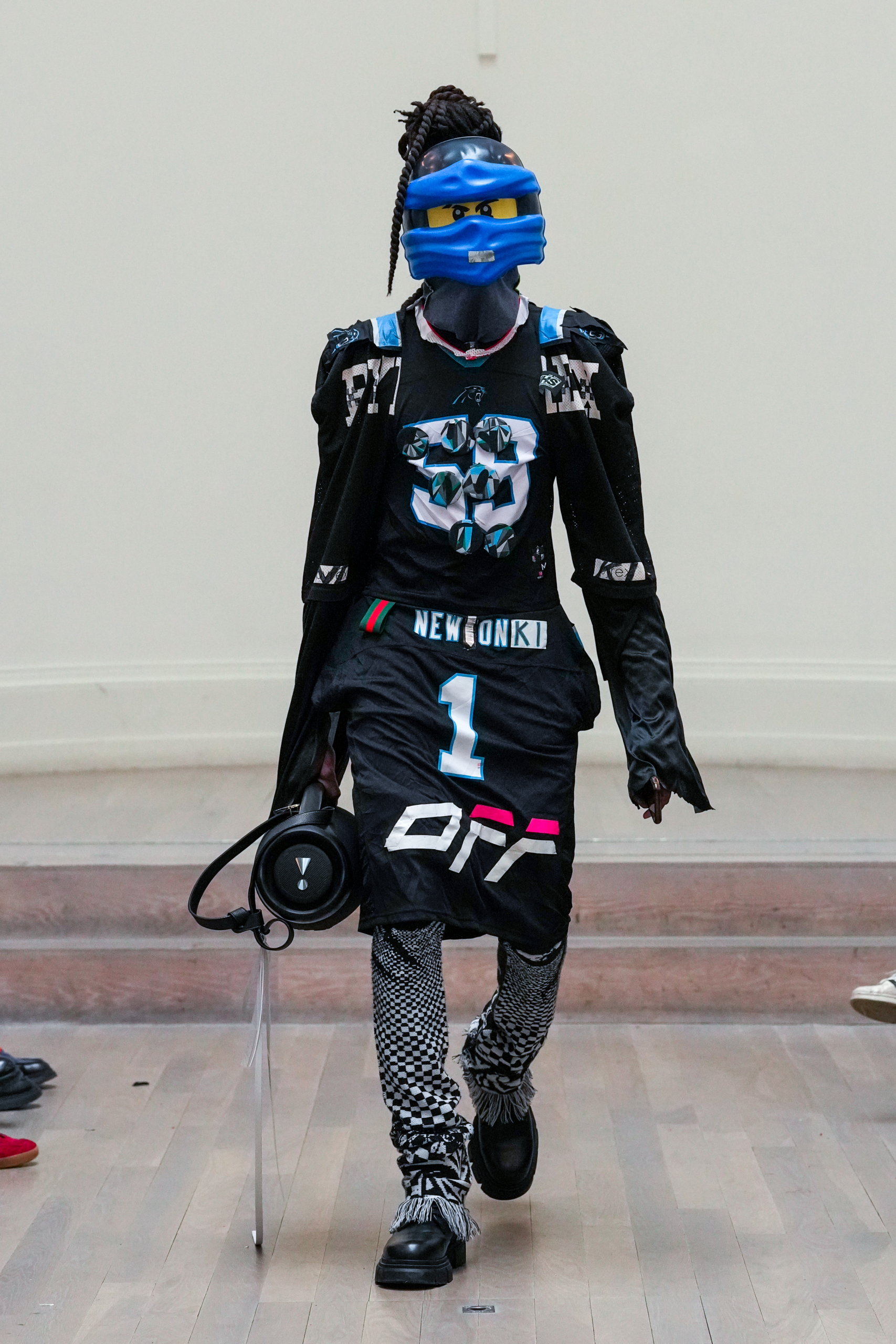 The 22-4-1 Evolutions is a collection of 22 custom builds from a shared source and blueprint. The original 2-4-1 debuted at the NESTT SS23 show, a reveal that showcased 2 looks in 1, and becomes the opening look and inception of the collection that follows. Noki has transformed this concept into a full collection of original creations standing as testament to his desire to re-use, re-purpose, re-imagine, and revolutionize how we view the fashion system. As always, everything seen on the catwalk is crafted from apparel destined for landfill, salvaged, saved, and reborn into dynamic new fashion through signature cut-and-splice clothing-collage and media mash-ups.